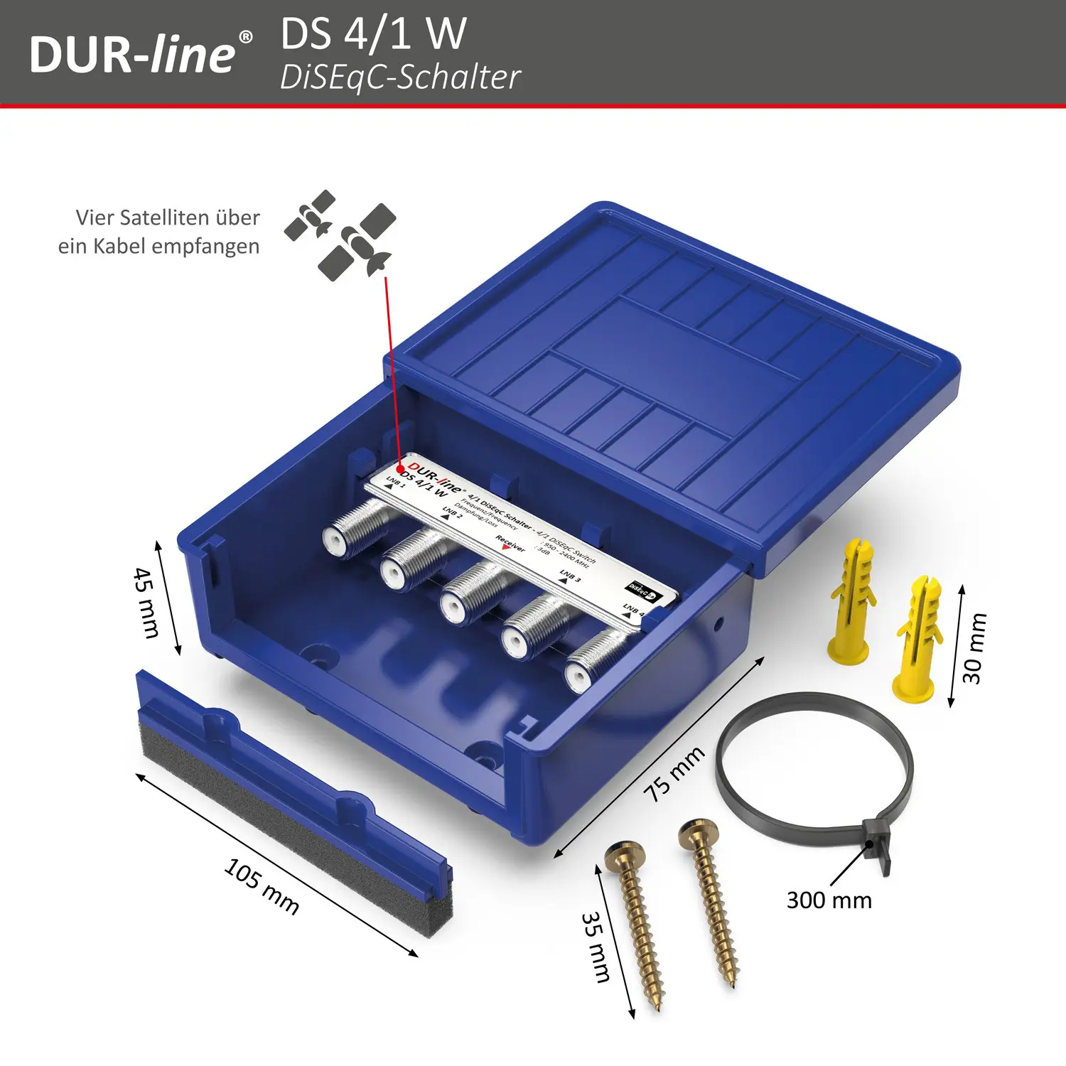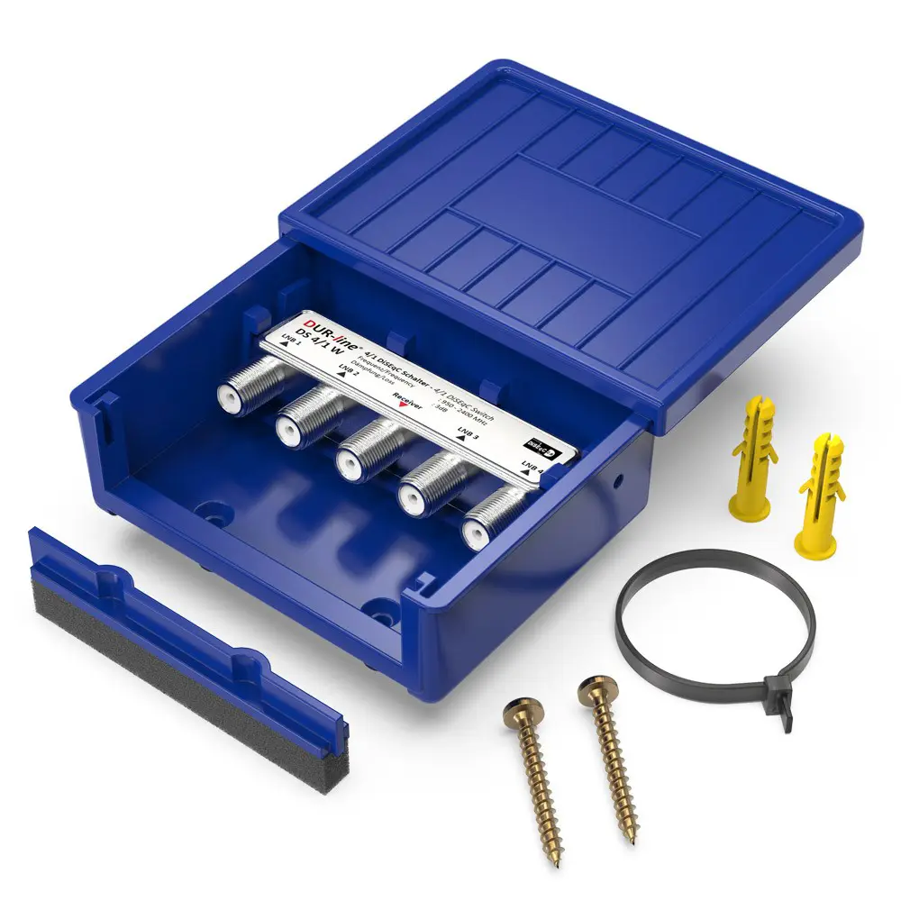 - LIEFERUMFANG: 4/1 Diseqc-Schalter im Wetterschutzgehäuse + 2x Schrauben (inkl. Dübel) + Kabelbinder (für Mastmontage)