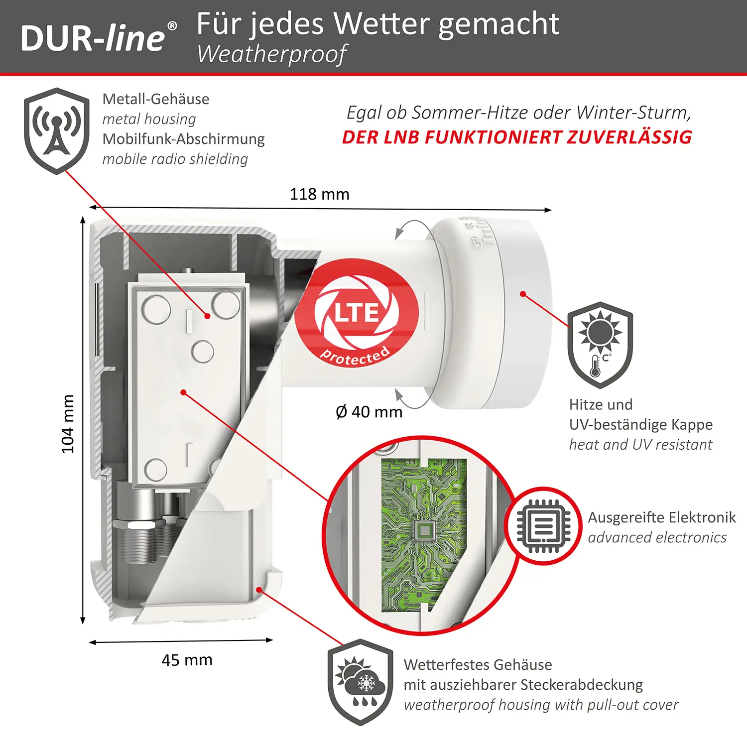 Die DUR-line LNB „+ Ultra" Serie zeichnet sich durch eine extreme Witterungsbeständigkeit aus. Egal ob tiefste Temperaturen oder größte Hitze. Eine reibungslose Funktion ist immer garantiert. Diese LNBs bieten eine ausgereifte Technologie für beste Bild- und Tonqualität.