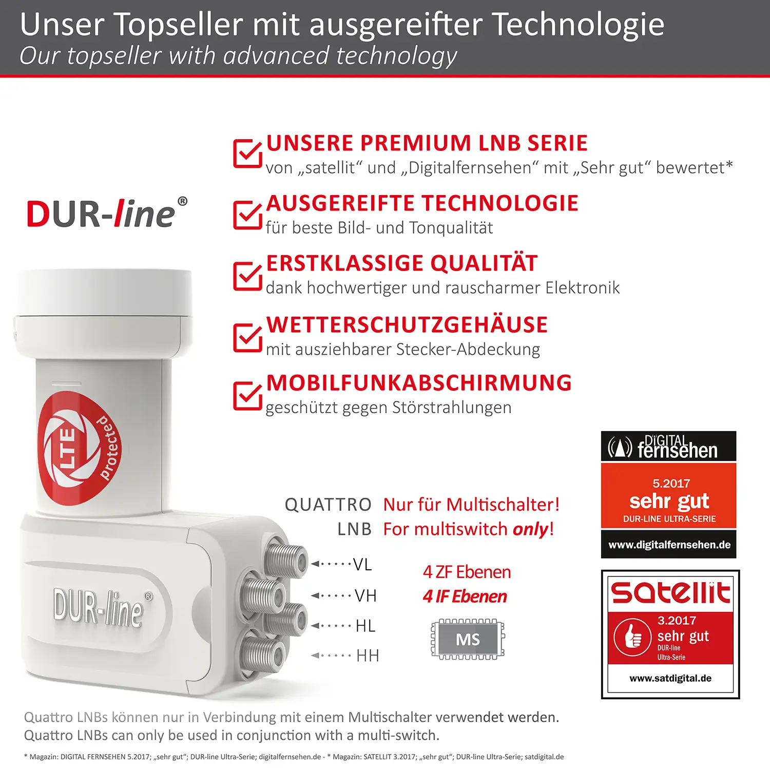 - TESTERGEBNISSE: 2X „SEHR GUT“ - * Magazin: DIGITAL FERNSEHEN 5.2017, „sehr gut“, DUR-line Ultra-Serie, digitalfernsehen .de - * Magazin: SATELLIT 3.2017, „sehr gut“, DUR-line Ultra-Serie, satdigital .de