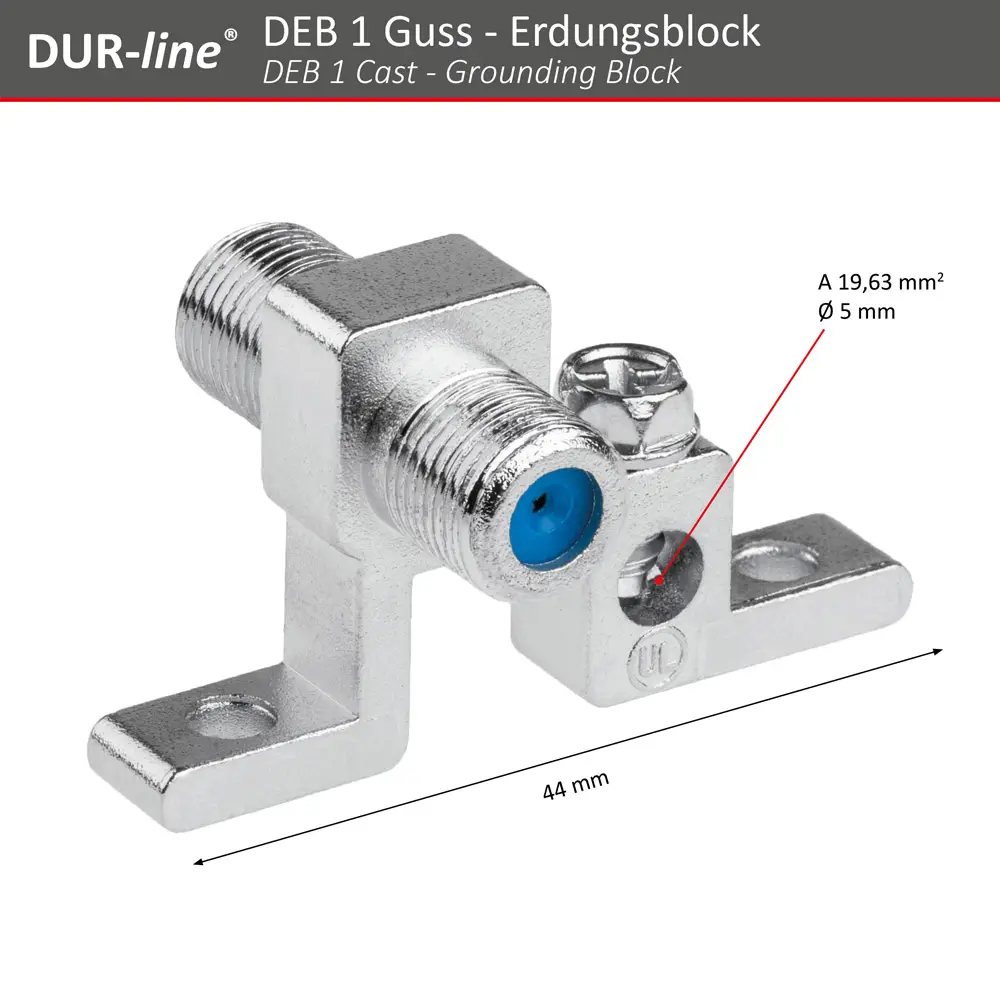 Dieser massive Erdungsblock mit 2 x 1 F-Anschlüssen sorgt für den Potentialausgleich von 1 SAT/Kabel/UKW/DVB-T Leitungen.