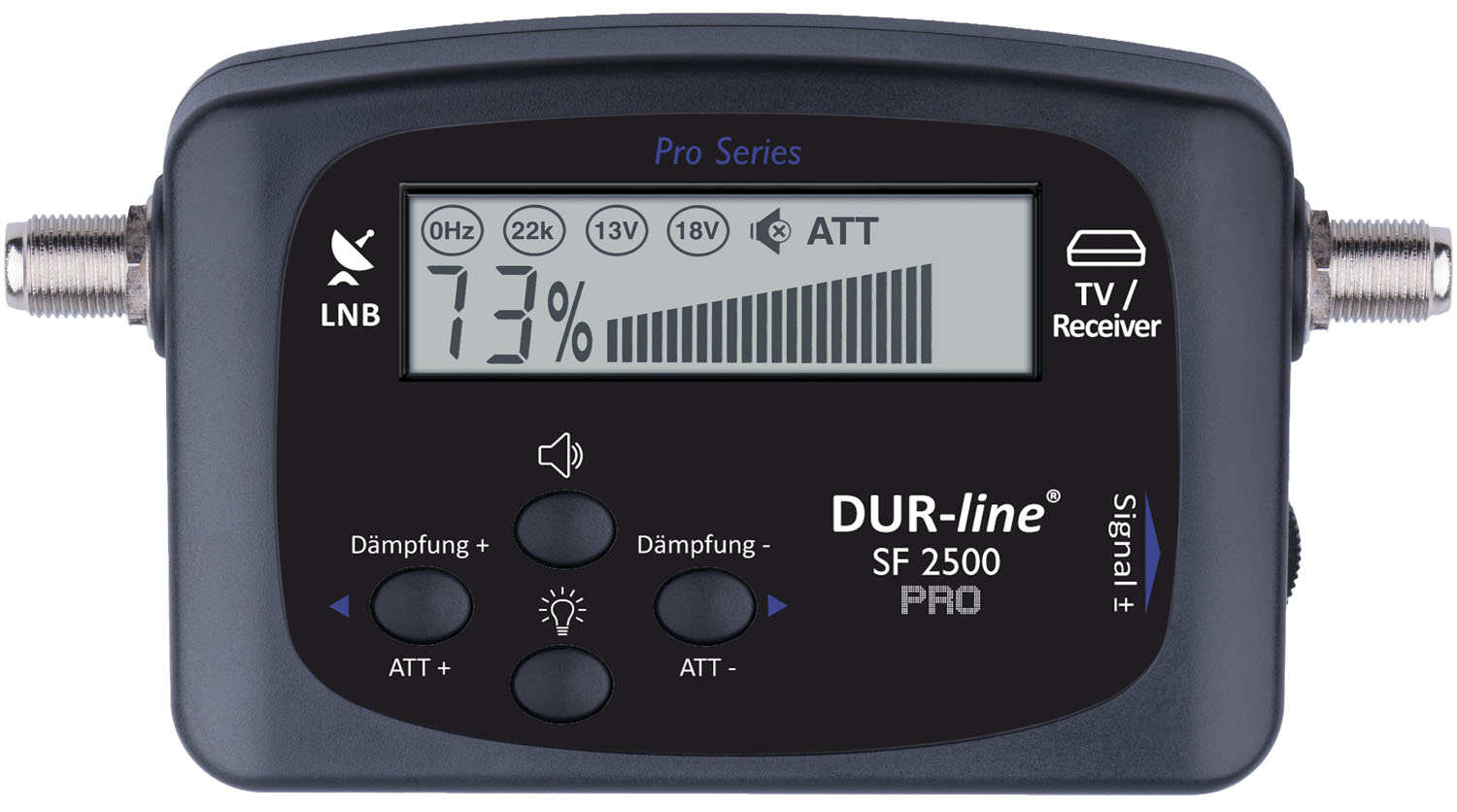 Dieses Gerät ist sehr empfindlich und kann auch schwächste Signale erkennen. Starke Eingangssignale (durch leistungsfähige Satelliten oder große Satellitenantennen) können mit den "Dämpfung +/" Tasten und dem seitlichen Einstellrad problemlos abgeschwächt werden. Dies ermöglicht ein optimales Auslesen und Einrichten verschiedenster Sat-Anlagen.