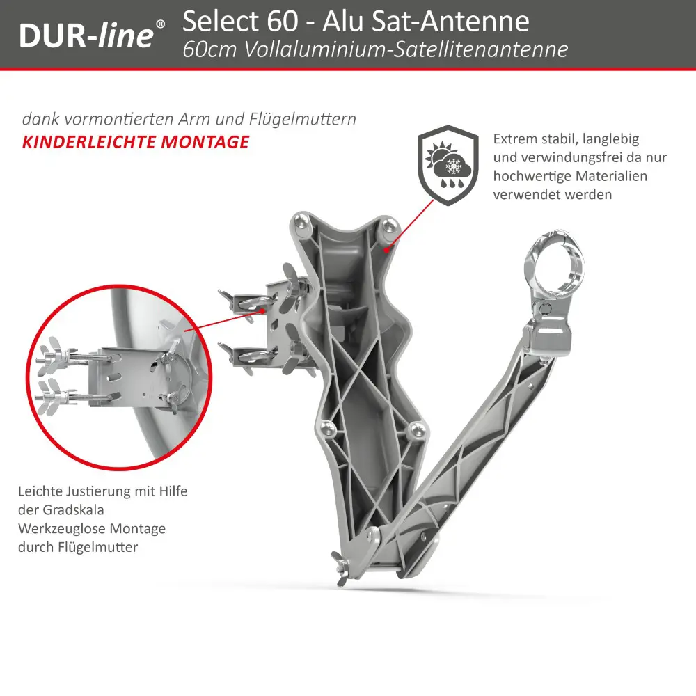 - Bestehend aus: DUR-line Select 60/65 Hellgrau - Satellitenantenne [ Im Test: 1,2 Oberklasse * ] + DUR-line +Ultra Single LNB [ Im Test: SEHR GUT* ]