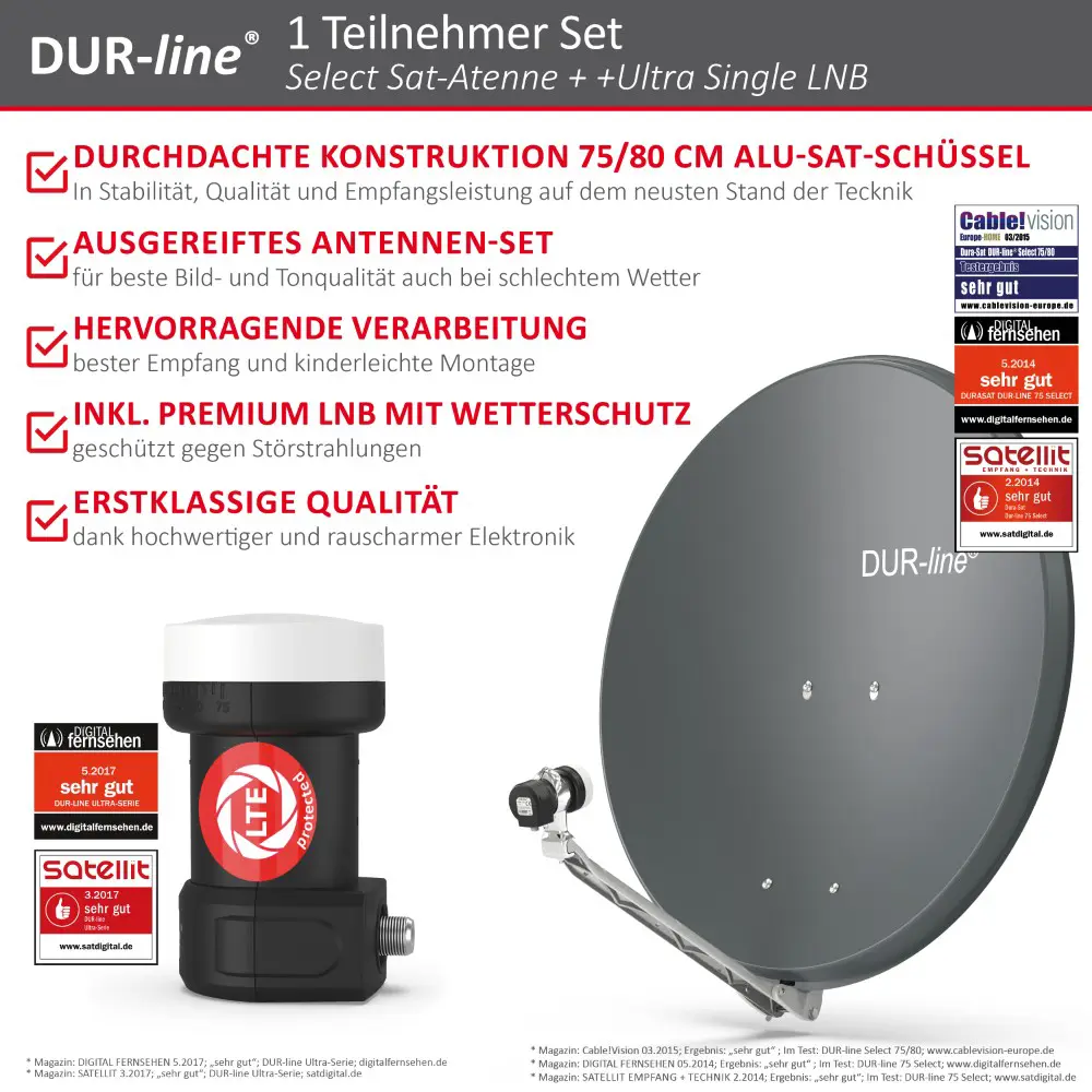 - LIEFERUMFANG > DUR-line Select 75/80 Anthrazit - Satellitenantenne [ 3x Test: SEHR GUT* ] + DUR-line +Ultra Single LNB [ Test: SEHR GUT* ]
