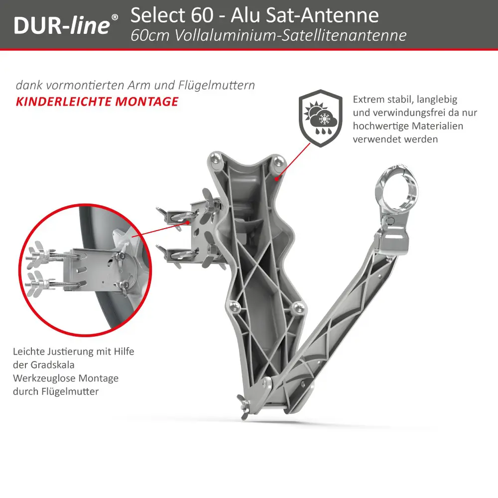 Hier erhalten Sie eine erstklassige Satanlage , bestehend aus der mehrfach ausgezeichneten DUR-line® Select 60/65 Satellitenantenne und einem nagelneuen DUR-line® +Ultra - LNB.