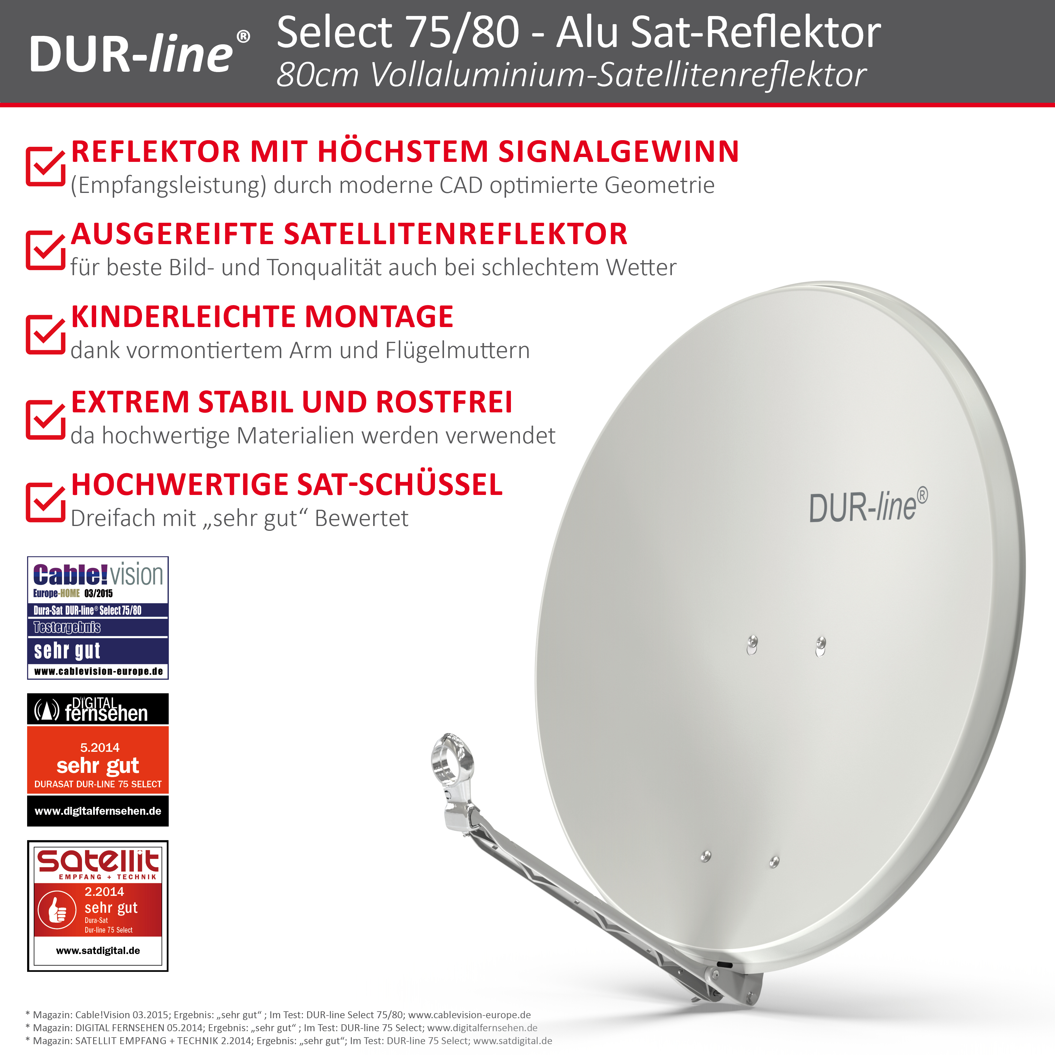 - * Magazin: DIGITAL FERNSEHEN 5.2014, Ergebnis: „sehr gut“, Im Test: DUR-line Select 75/80, digitalfernsehen .de - * Magazin: SATELLIT 2.2014, Ergebnis: „sehr gut“, Im Test: DUR-line Select 75/80, sat