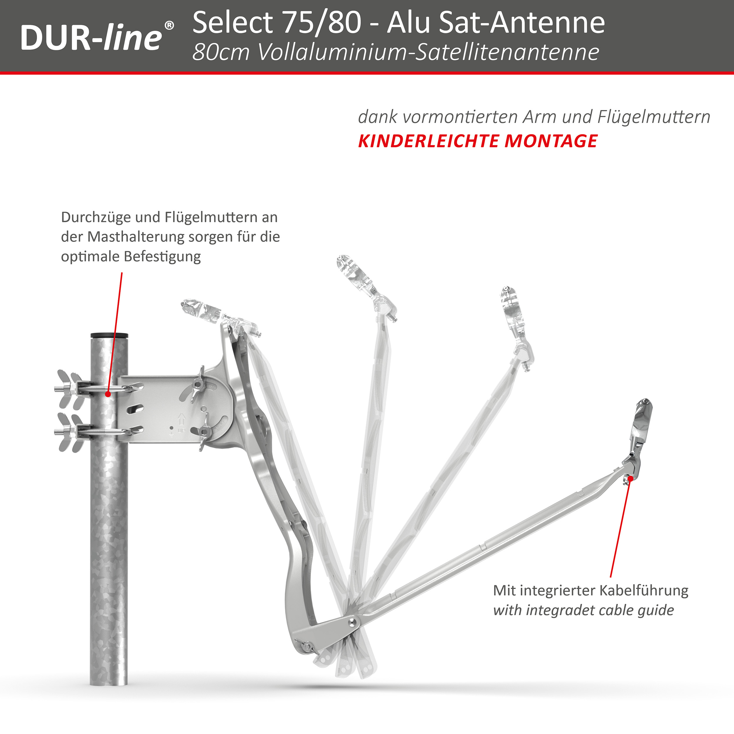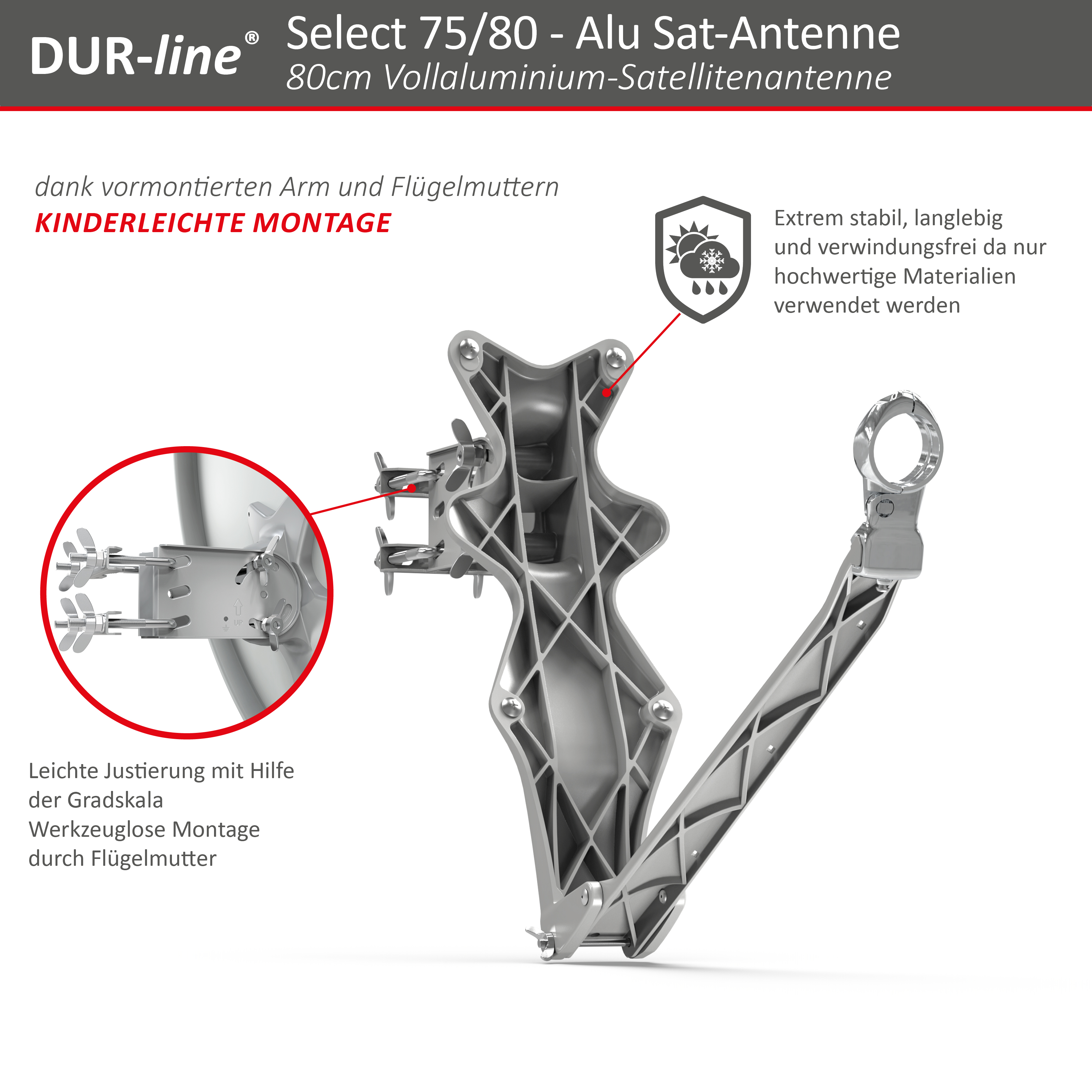 Die neue DUR-line® Select Satellitenschüssel-Serie ist in Stabilität, Design und Empfangsleistung auf dem neuesten Stand der Technik. Höchste Ansprüche wurden bis ins kleinste Detail verwirklicht. Auch starke Stürme können diesem Spiegel nichts anhaben!