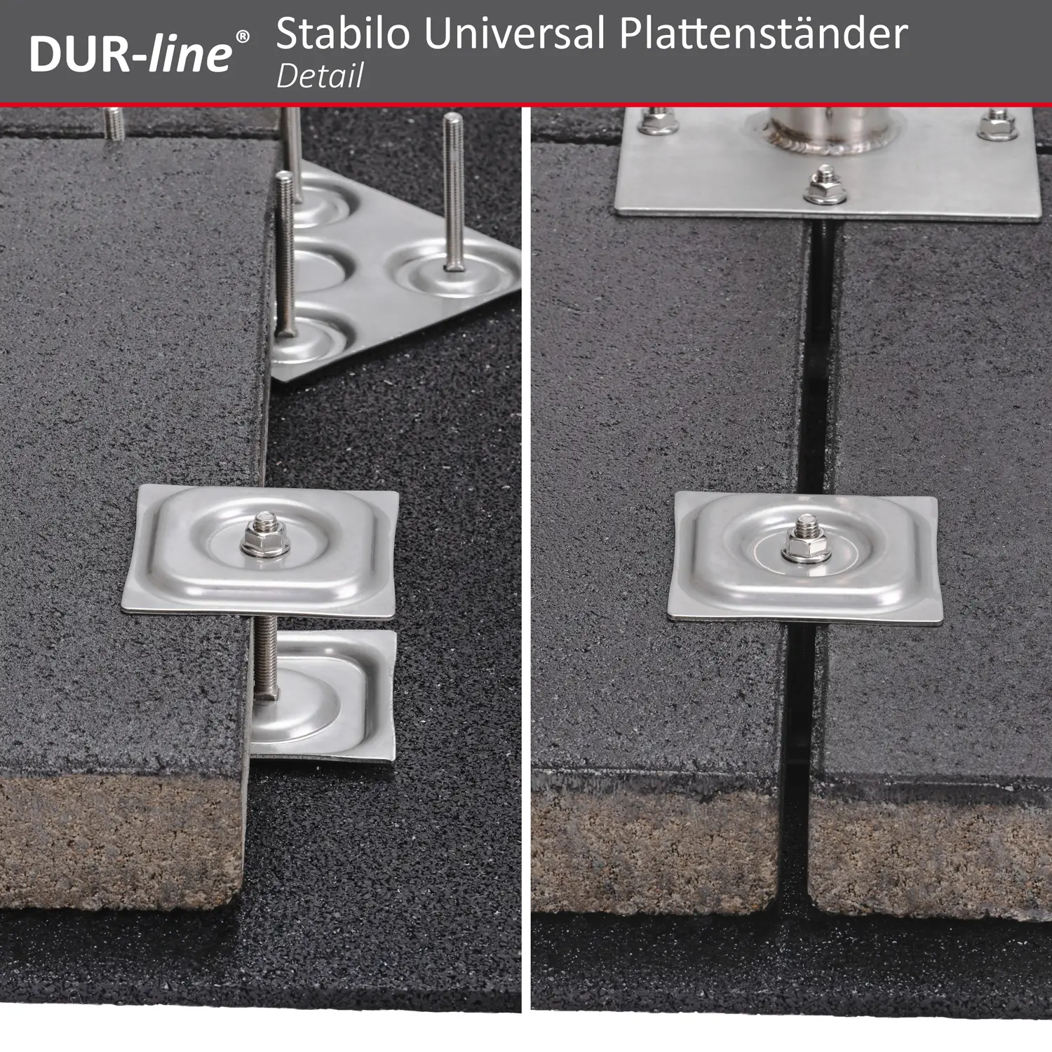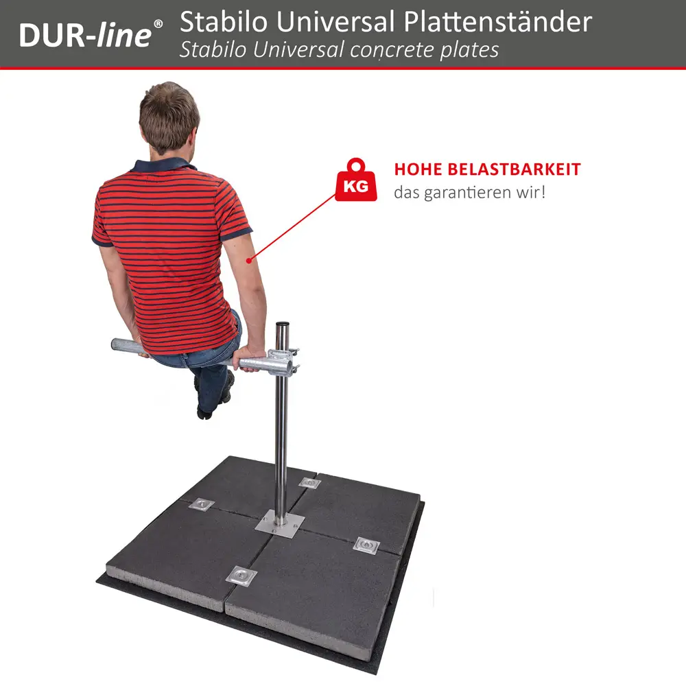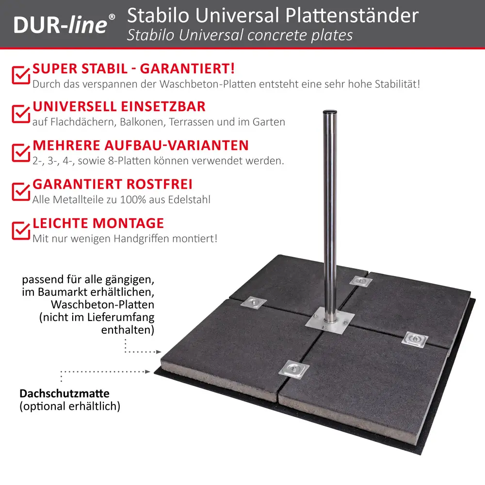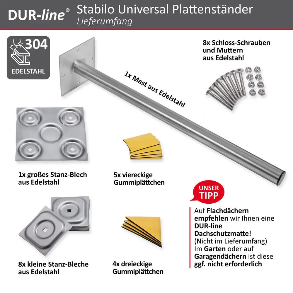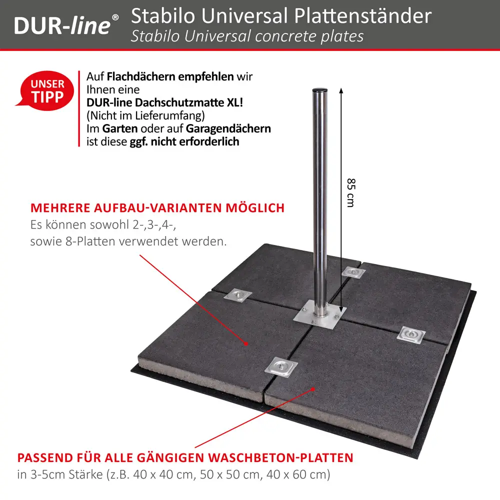 Die mitgelieferten drei und viereckigen Gummiplättchen zum Aufkleben erhöhen die Standfestigkeit und schützen Untergrund vor Kratzern. Auf Flachdächern wird eine optional erhältliche Dachschutzmatte (1,05m x 1,05m) zum Darunterlegen empfohlen. Auch eine Mastverlängerung ist mit der Doppelmastschelle von DUR-line möglich (Geben sie folgende Nr. in die Amazon-Suche ein: B01035TCP0)